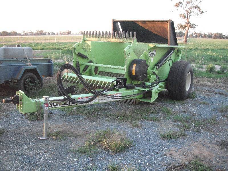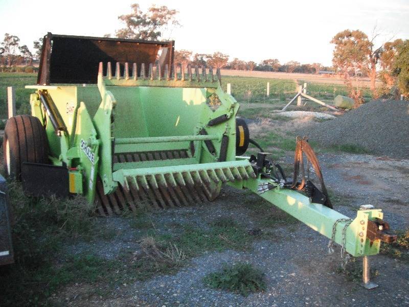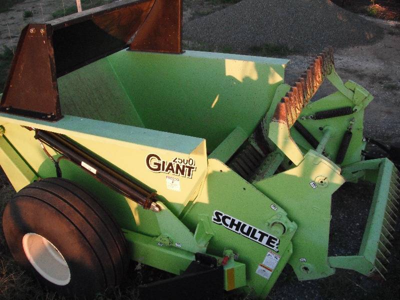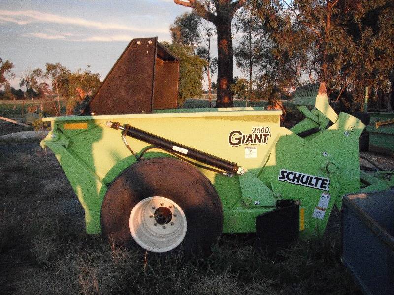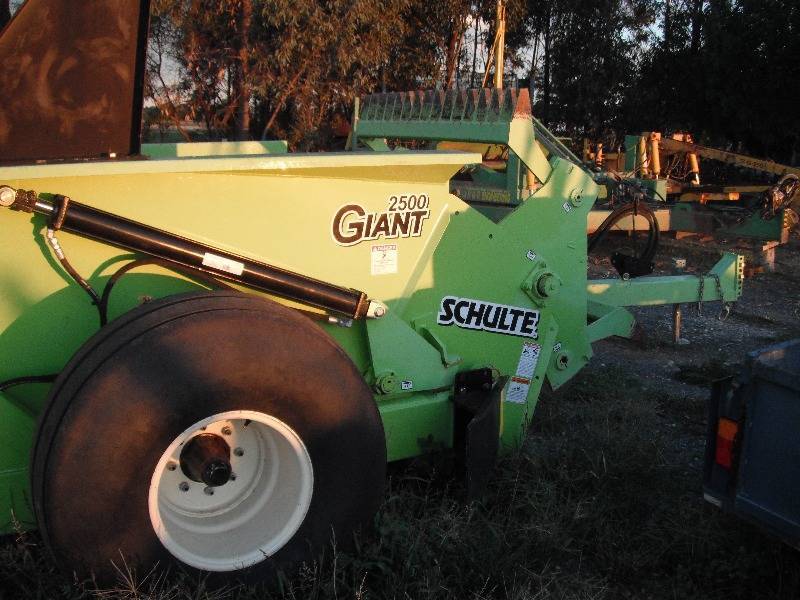 2009 SCHULTE 2500 GIANT Rock picker with very few hours in as new condition. The grille has been modified with an Aussie grille by Schulte to assist with the picking up of smaller rocks. Schulte Giant 2500 Rock picker with very few hours in as new condition. The grille has been modified with an Aussie grille by Schulte to assist with the picking up of smaller rocks. The data on the rock picker is as follows: Specifications 2500 Giant Rock Picker Weight (Approximate) 4970 lbs (2254 Kg) Overall length 205 (5207 mm) Width with tyres 114 (2896 mm) Width less tyres 91 inch (2311 mm) Hopper capacity 2.5 cubic yards (1.9 M3) Picking width 60 inch (1524 mm) Dumping height 49 (1245 mm) Tyre size 16.5L x 16.1 Minimum tractor size 75 HP (56Kw) Normal maximum ground speed 4 MPH (6.4 KPH) Tractor hydraulic requirement 12 GPM @1800 PSI, dual remote outlets Hydraulic motor displacement 14.9 cubic inch/revolution Final drive ratio 4:1 Drive sprockets 11T and 45T #80 Cross over relief valve 1750 PSI cracking pressure Flow control 0-15 GPM Recommended reel speed 36-37 RPM Pick rocks 2 inch to 27 inch (smaller with aussie grille)