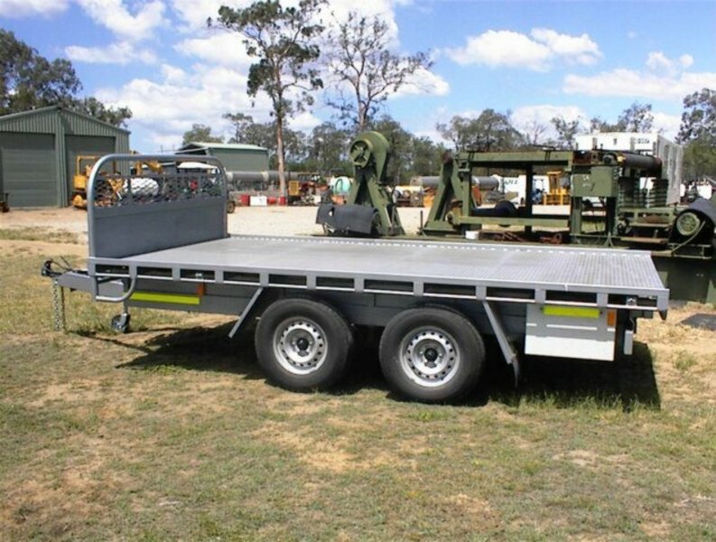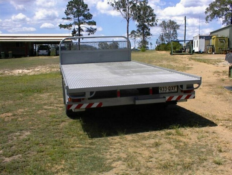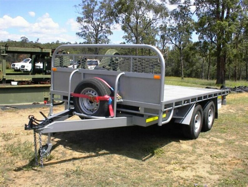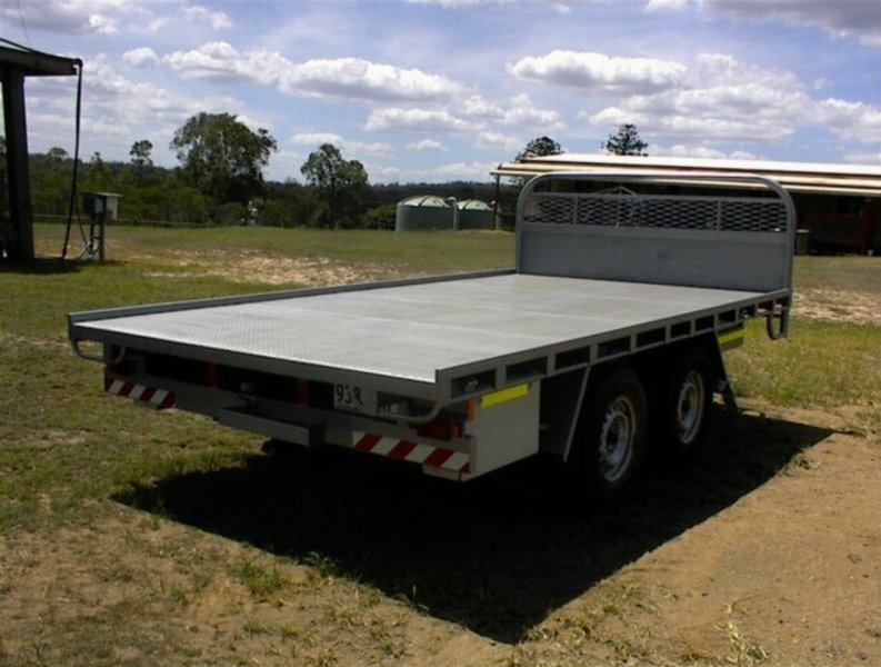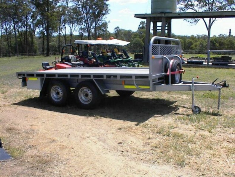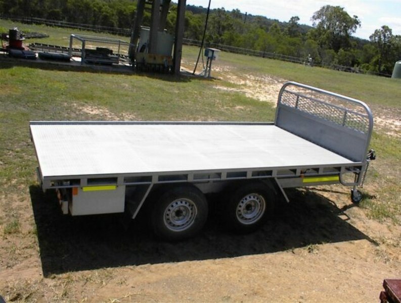 Flat top tandem trailer, 4.4m x 2.4m deck, all steel construction, 4 wheel electric brakes and breakaway system , 16 inch light truck tyres, with spare tyre, 15/10/2013 build, unused, registered, rego number 933QXF, 3500KG GVM, 1140KG tare, very well built trailer.