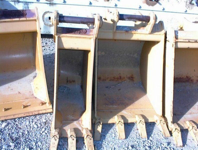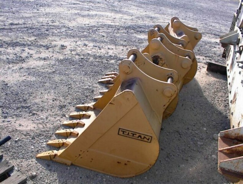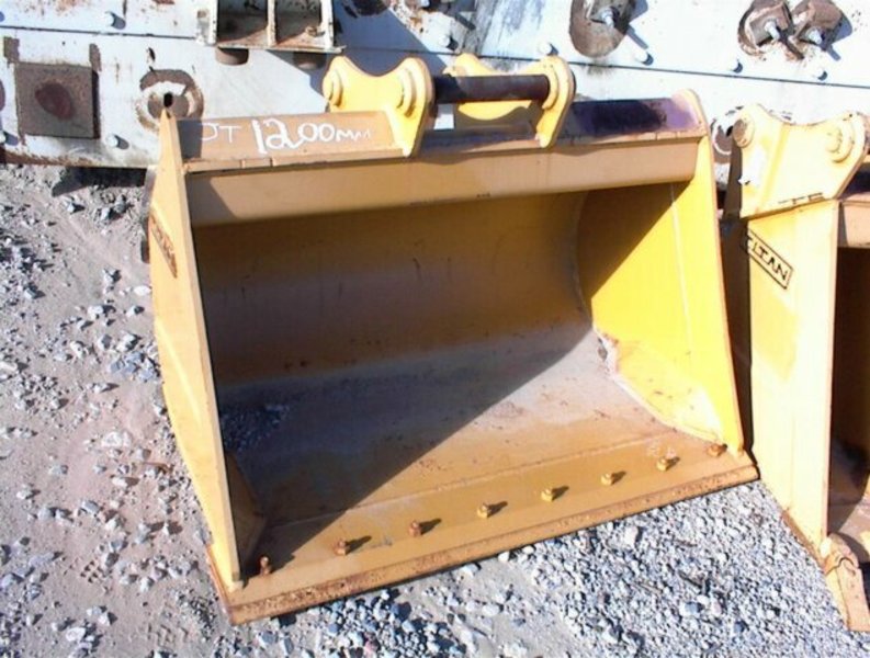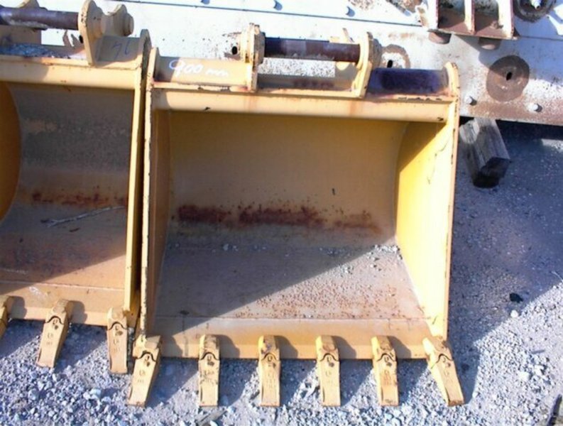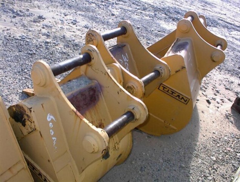 Titan excavator buckets, suit approx 12 tonne machine, 300mm toothed, 600mm toothed, 900mm toothed, 1200mm cutting edge, with pins to suit quick hitch, front pin 50mm dia., rear pin 45mm dia., 350mm pin centers, 260mm between ears, set of 4 buckets unused.