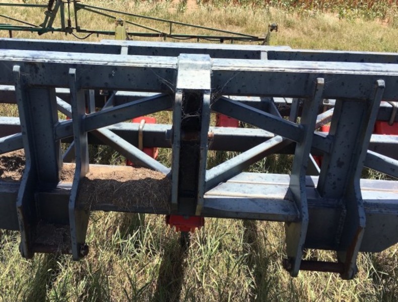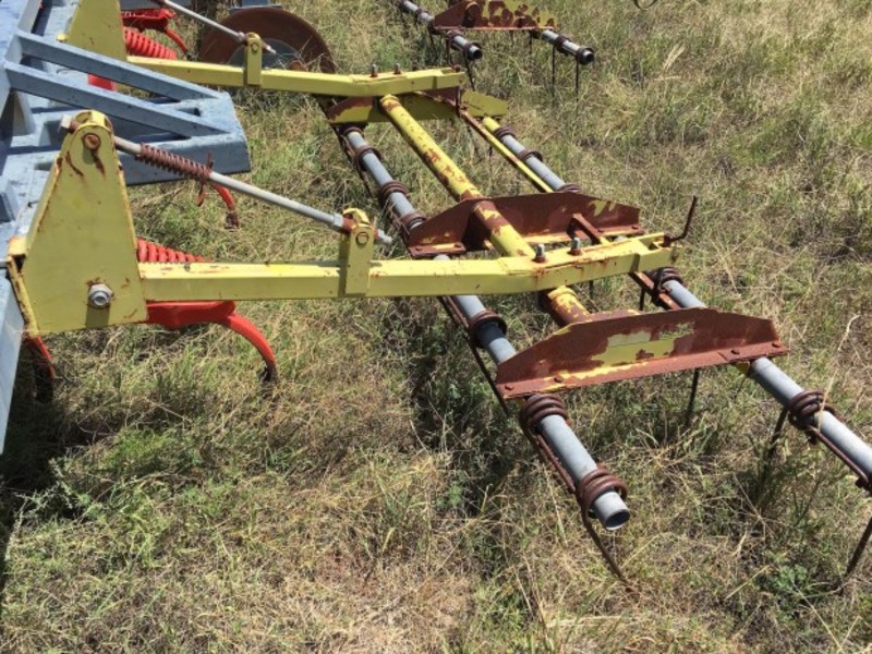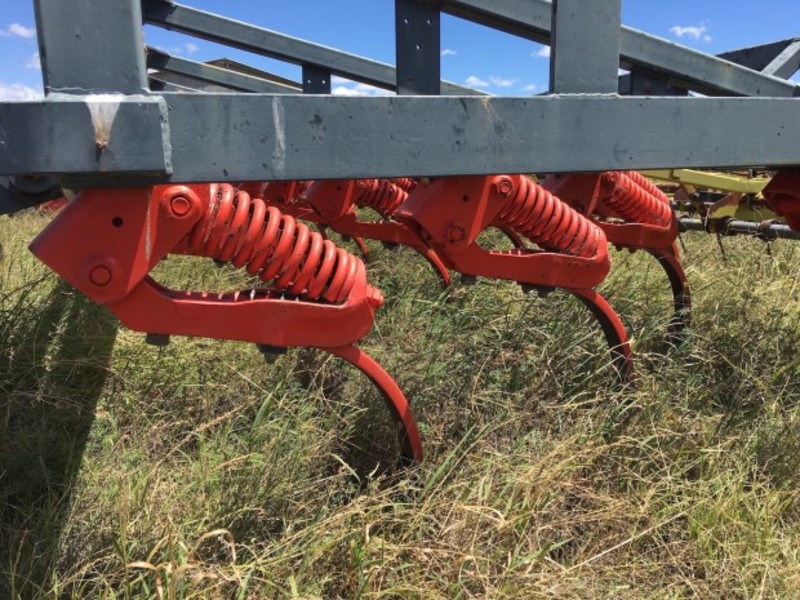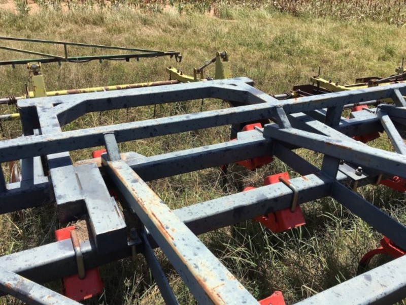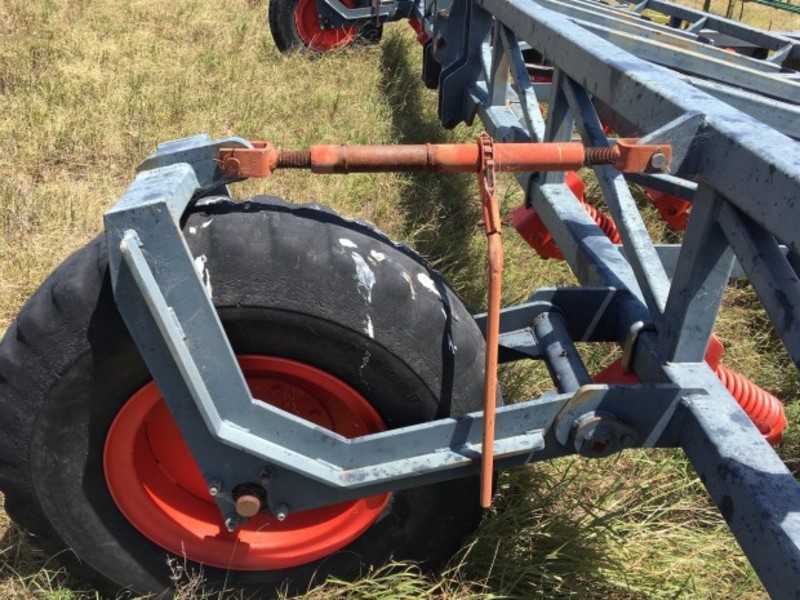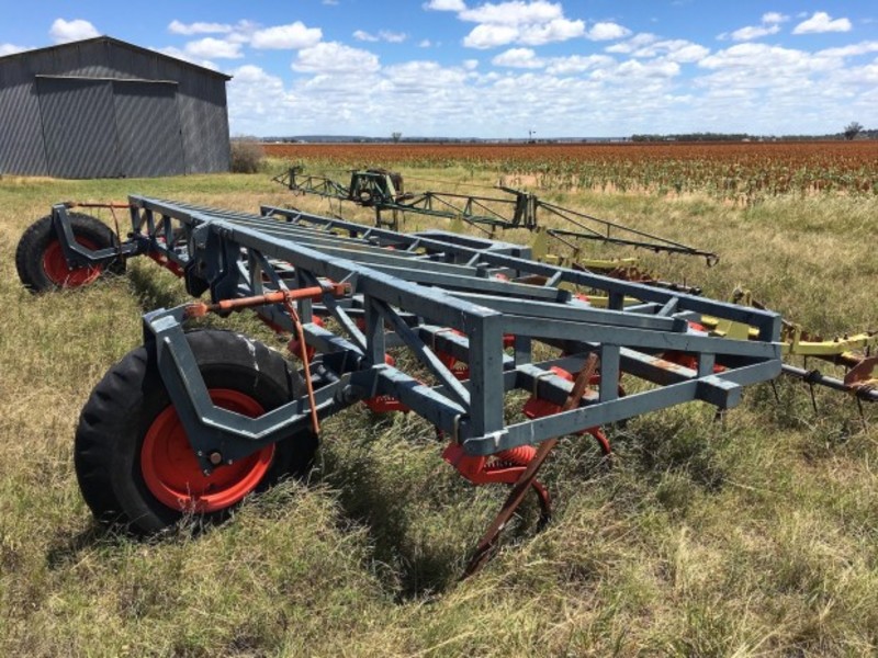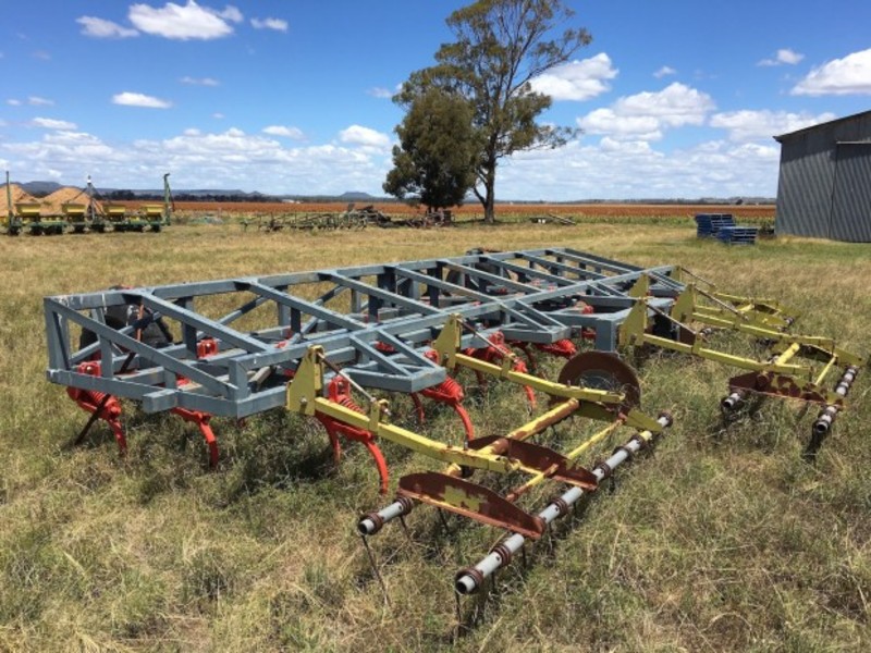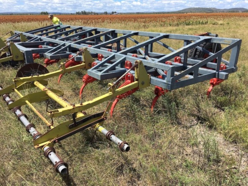 Custom Built Chisel plough, 8 metre toolbar, heavy duty frame and 12.00R20 gauge wheels, 3 point linkage attachment, 35 x chisel plough tynes, chisel points, set of sweeps to go with it, rear stabiliser disc assembly, Big Rig mounted harrows, located near Oakey, price includes GST.