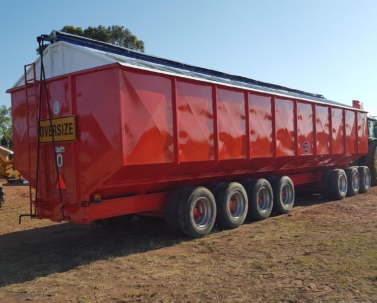 Dunstan Mother Bin, 75 tonne, 16 inch hydraulic fold unload auger, roll over tarp, front and rear inspection windows, extensive refurbishment carried out and paint work, located near Narrabri NSW, price includes GST