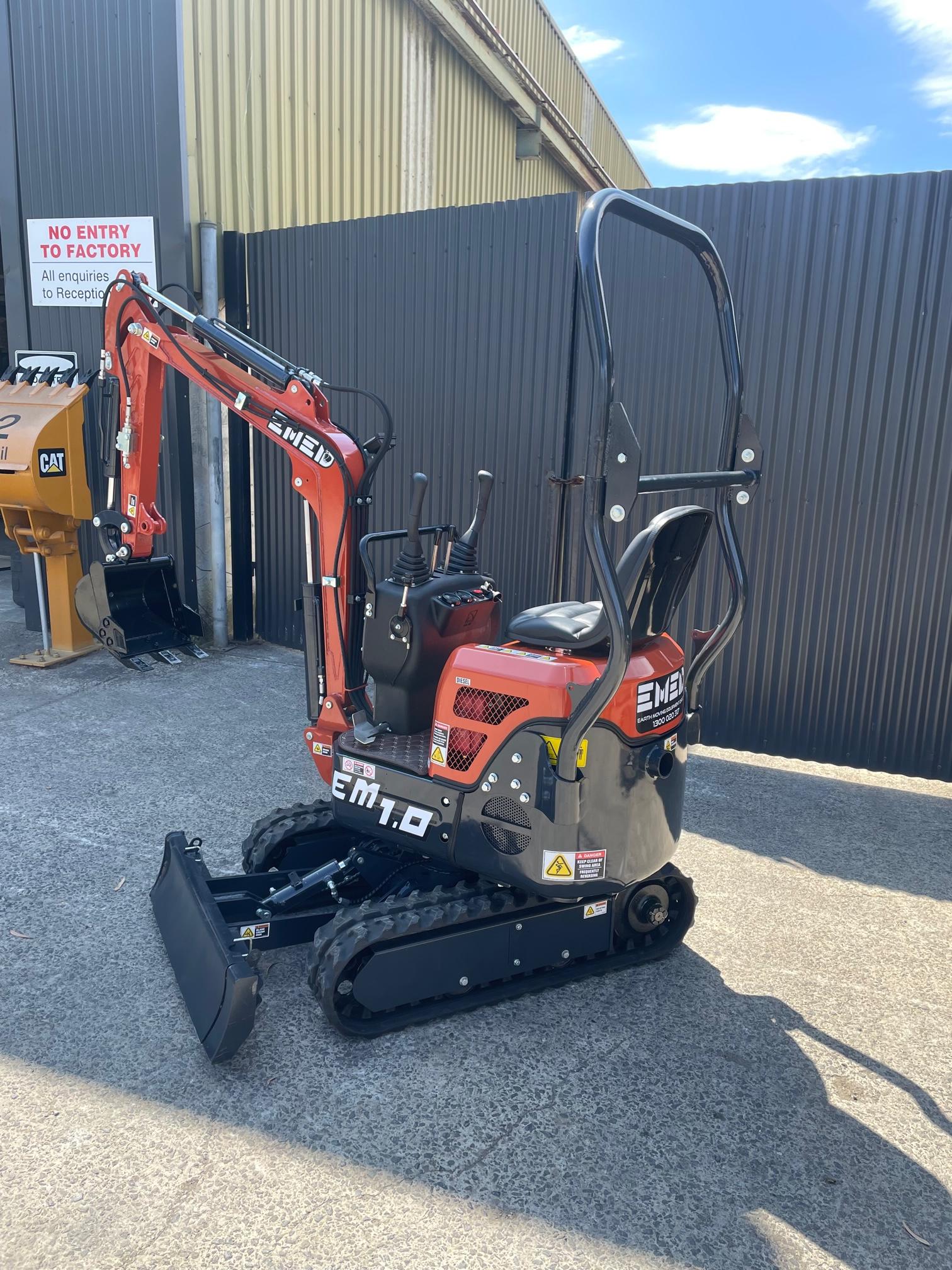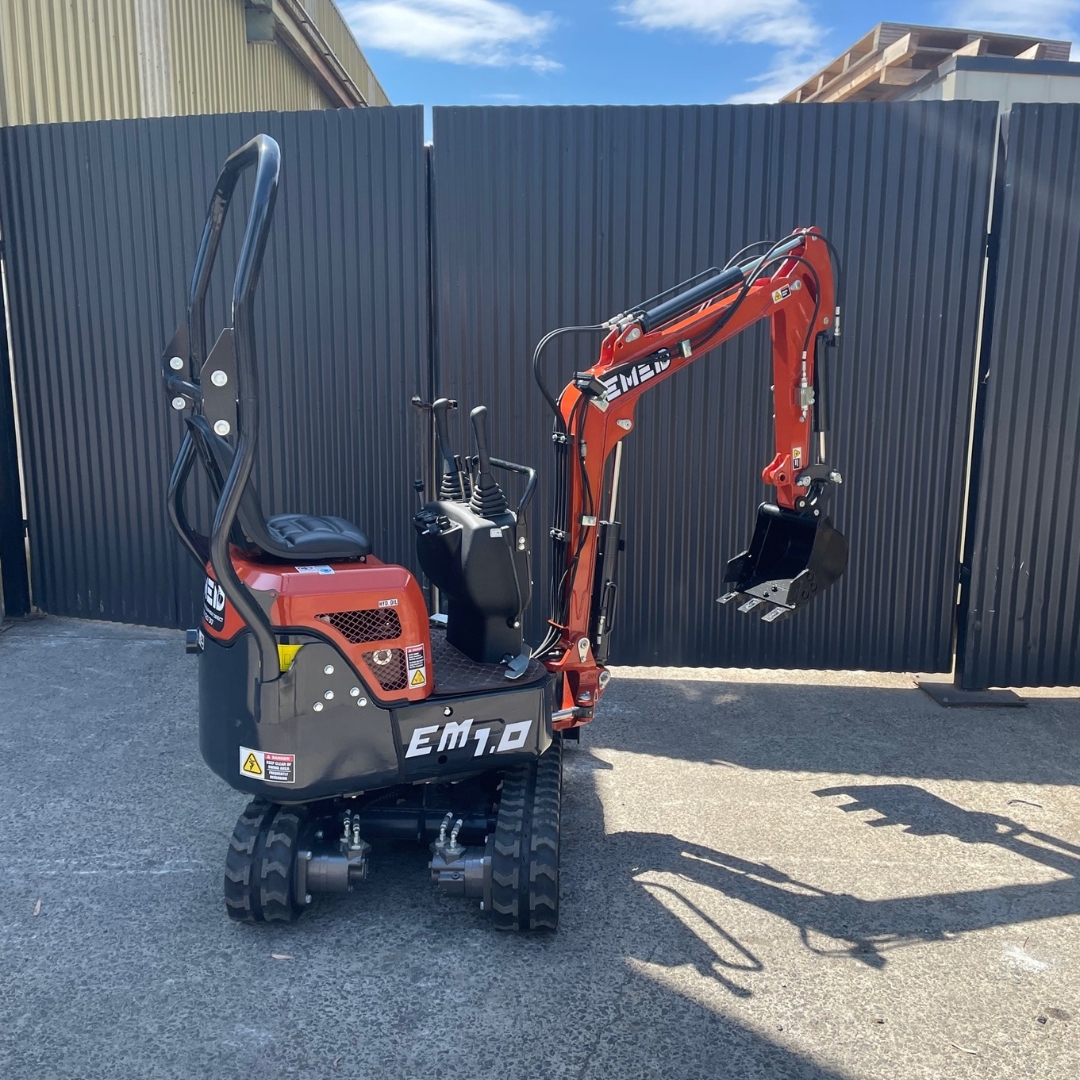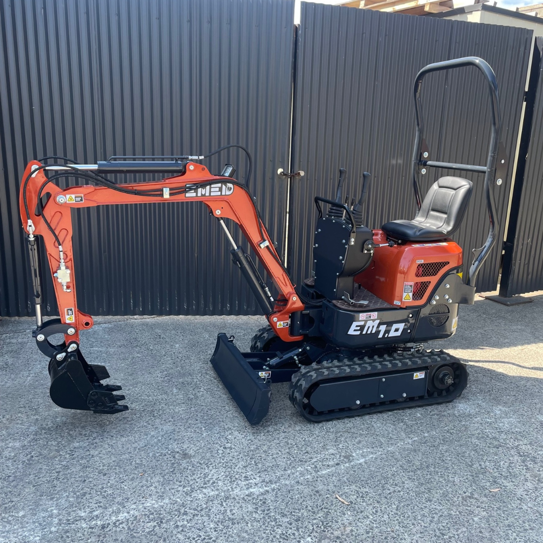 EM1.0 Mini Excavator 1 Ton with Swing Boom & Expandable Tracks. Perfect for tight access areas. $17,900 Plus GST or from $87* per week Description: EMED Mini Excavator EM1.0, operating weight of 950kg this excavator is designed for small works and projects, with expandable tracks and swing boom. Model: EM1.0 Specification: Machine Weight: 950 Kg Bucket Capacity: 0.022 m³/100kg Bucket Width: 360mm Engine: KOOP Rated power: 8.2 kw/2200r/min Track type: Rubber track Main Dimensions: Overall dimension (L x W x H) 2600 x 730 (950) x 1480 Wheelbase: 770mm Chassis width: 730-950mm Total length of track: 1200mm Track width: 180mm Operating Range Max. Digging depth: 2000mm, Max. Vertical digging depth: 1600mm Max. Digging height: 2580mm Max. Dumping height: 1830mm Max. Digging radius on ground: 2700mm Min. Rotation radius: 1290mm Attachments Included: 200mm Bucket 360mm Bucket 500mm Bucket 1000mm Bucket Mechanical Quick Hitch Ripper Rake Log Grab Warranty And What It Covers: 2 Year Warranty & Lifetime support We will supply parts and labour for the first year/1000 hours, meaning if in the unlikely event your machine breaks down during the first year, we will supply the parts and labour to get your machine operational again. This might mean taking your machine to a local repair centre, having your local mechanic visit you, or us organising another method. You are fully supported and backed up with our 1-year parts and labour guarantee we will work with you to get you sorted asap. In addition to the above we also offer a 2-year parts warranty from the date of purchase. If you have any issue with your machine outside of normal wear and tear items such as tracks, washers, batteries, fan belts etc we will supply all parts to you so you can quickly and easily replace them and keep the machine operational. Other Benefits: Australia-wide delivery Available for private retail & commercial purchase Bulk order specialists Dedicated after-sales help and support – 1300 direct line to our help staff. Got a question? We are happy to help Easy add-on equipment – Select from our full range of add on equipment. Interested in finding out more about how our excavation machinery can better serve YOU? Well, if you’d like to know more about Earthmoving Equipment Direct or have any questions about our mini or larger sized excavators, just give us a call on 1300 020 317. Alternatively, learn more in your own time and at your own leisure with our Complimentary Price & Product Excavator Guide. Even seasoned operators and businesses who use excavators daily find the Earthmoving Equipment Direct Excavator Price and Product Guide an invaluable resource of information full of helpful tips on what to look for and avoid before buying excavators singularly or in bulk. You’ll discover some of our most popular models of excavators, from our 0.8 Ton mini excavator up to our 2.1 Ton, and other benefits based on our years of expertise in servicing and selling excavators to plumbers, builders, landscaping services, agriculture and other businesses throughout Australia. *Finance available for approved applicants