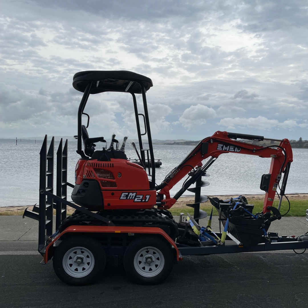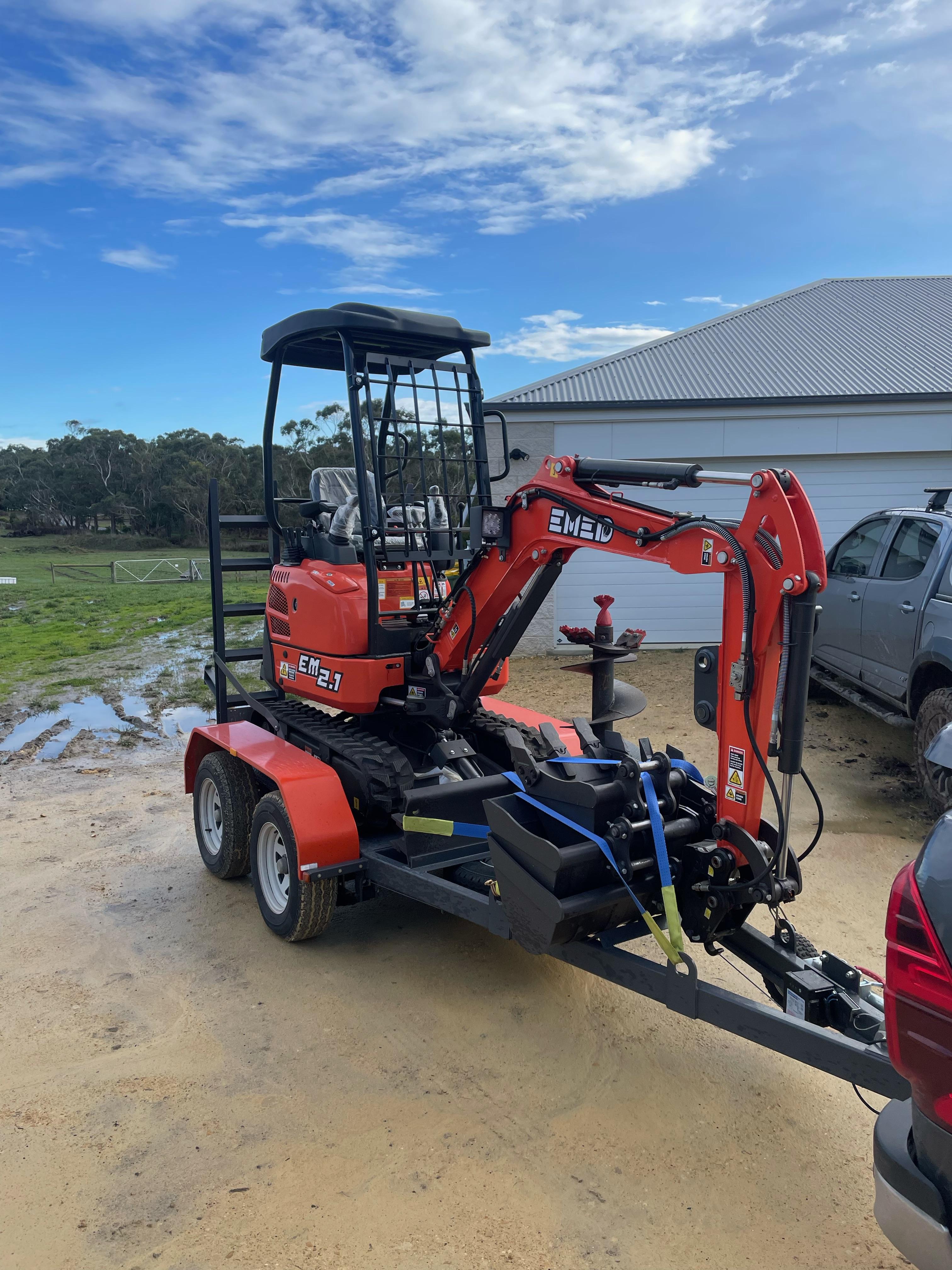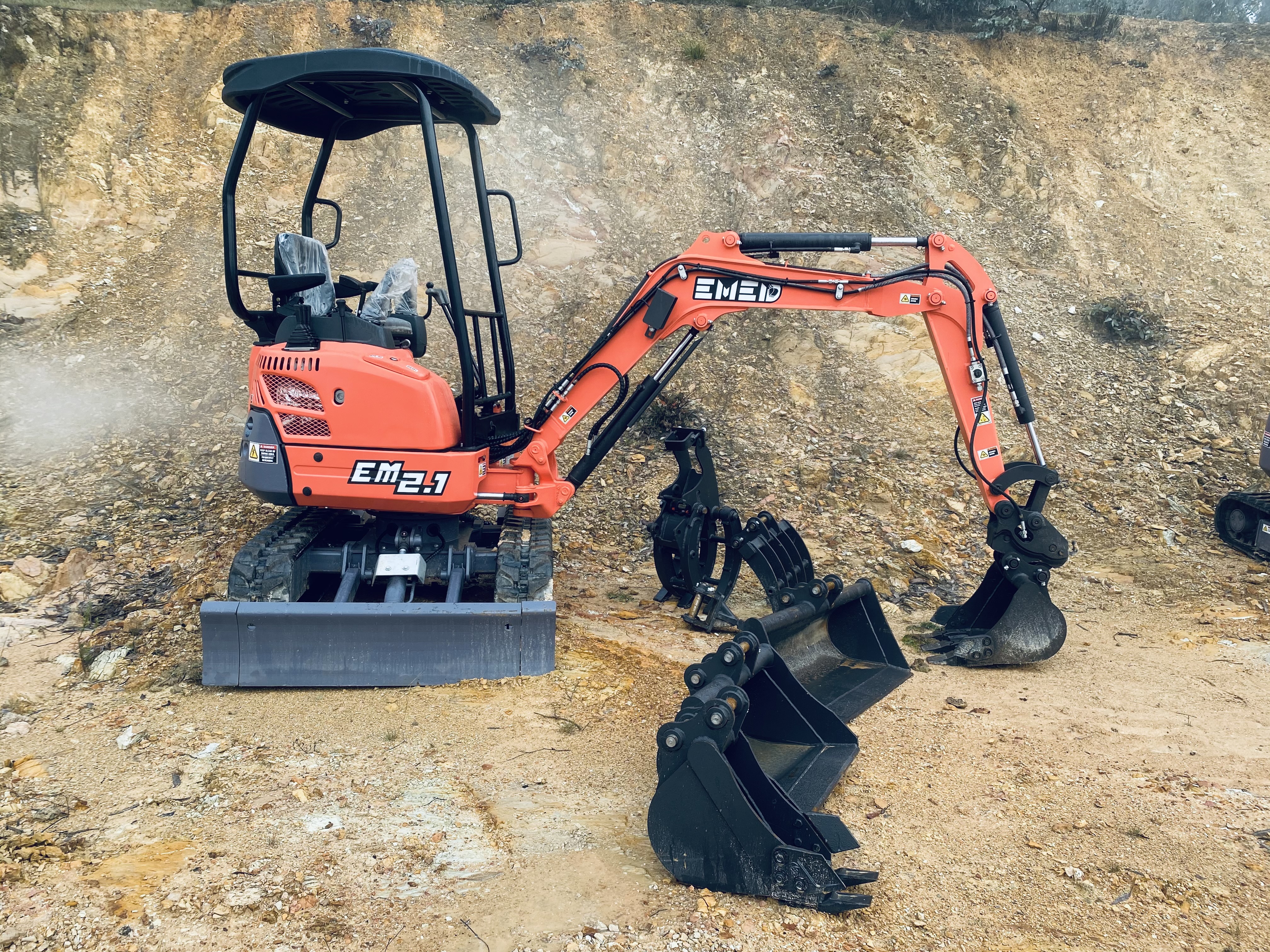 The EM2.1 Excavator, packed full of features. Swing boom, expandable tracks, pilot controls, Yanmar Engine, KDK Hydraulics, Eaton Swing Motor. This package includes: EM2.1 Excavator with swing boom and expandable tracks Trailer to suit mini Excavator 3.5 ton rated Auger with driver 300mm Hammer to suit EM2.1 Plus the FREE Standard Inclusions: • Trenching Bucket 200mm • GP Bucket 400mm • Mud Bucket 600mm • Mud Bucket 1000mm • Hydraulic Quick Hitch • Rake • Ripper • Mechanical grab First service filter kit & Tool kit. Excavator Trailer. All Steel construction, made in Australia. Suitable for Excavators, Skidsteers and other Machinery. Rated to 3.5 Ton Payload weight is 2750 kg’s Fits all attachments Width between guards is 1150mm, the bed length is 1660mm and the total length is 4.4m. 4 Wheel Electric Brakes 5 Rims and Tyres Specification: Model: EM2.1 Brand: EMED Operating Weight: 1900kg Expandable Tracks Swing Boom Digging bucket capacity: 0.048cbm Digging bucket width: 420mm Engine: YANMAR 3TNV74F Rated power: 11.2kw/15.01hp/2200r/min Displacement: 0.854L Main Dimensions: Overall dimension (LxWxH): 3400 x 990 (1240) x 2380mm Total length of track on land: 1590mm Platform ground clearance: 473mm Platform back turning radius: 790mm Chassis width: 990mm (1240) Track width: 230mm Track height: 360mm Operating Range: Max. Digging depth: 3700mm Max. Vertical digging depth: 1740mm Max. Digging height: 3275mm Max. Dumping height: 2310mm Max. Digging radius on ground: 3610mm Min. Rotation radius: 1580mm Warranty And What It Covers: 2 Year Warranty & Lifetime Support We will supply parts and labour for the first year/1000 hours, meaning if in the unlikely event your machine breaks down during the first year, we will supply the parts and labour to get your machine operational again. This might mean taking your machine to a local repair centre, having your local mechanic visit you, or us organising another method. You are fully supported and backed up with our 1-year parts and labour guarantee we will work with you to get you sorted asap. In addition to the above we also offer a 2-year parts warranty from the date of purchase. If you have any issue with your machine outside of normal wear and tear items such as tracks, washers, batteries, fan belts etc. we will supply all parts to you so you can quickly and easily replace them and keep the machine operational. Other Benefits: Australia-wide delivery Available for private retail & commercial purchase Bulk order specialists Interested in finding out more about how our excavation machinery can better serve YOU? Well, if you’d like to know more about Earthmoving Equipment Direct or have any questions about our mini or larger sized excavators, just give us a call on 1300 020 317. Alternatively, learn more in your own time and at your own leisure with our Complimentary Price & Product Excavator Guide. Even seasoned operators and businesses who use excavators daily find the Earthmoving Equipment Direct Excavator Price and Product Guide an invaluable resource of information full of helpful tips on what to look for and avoid before buying excavators singularly or in bulk. You’ll discover some of our most popular models of excavators, from our 0.8 Ton mini excavator up to our 2.6 Ton, and other benefits based on our years of expertise in servicing and selling excavators to plumbers, builders, landscaping services, agriculture and other businesses throughout Australia. *Finance available for approved applicants