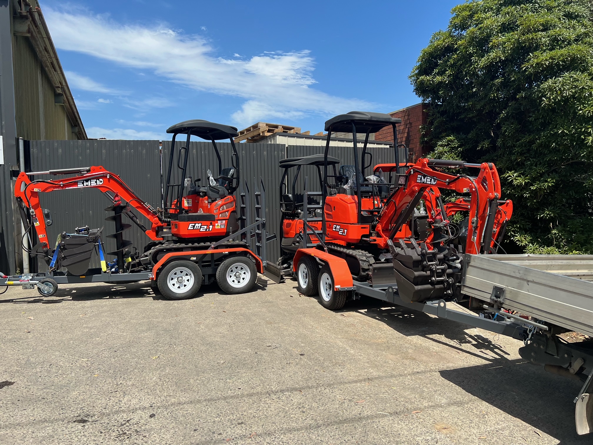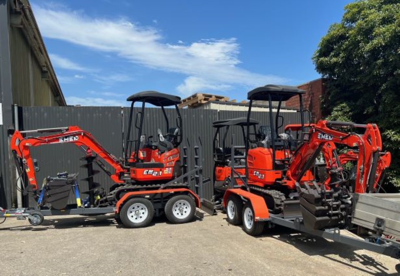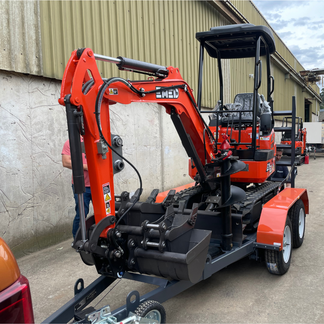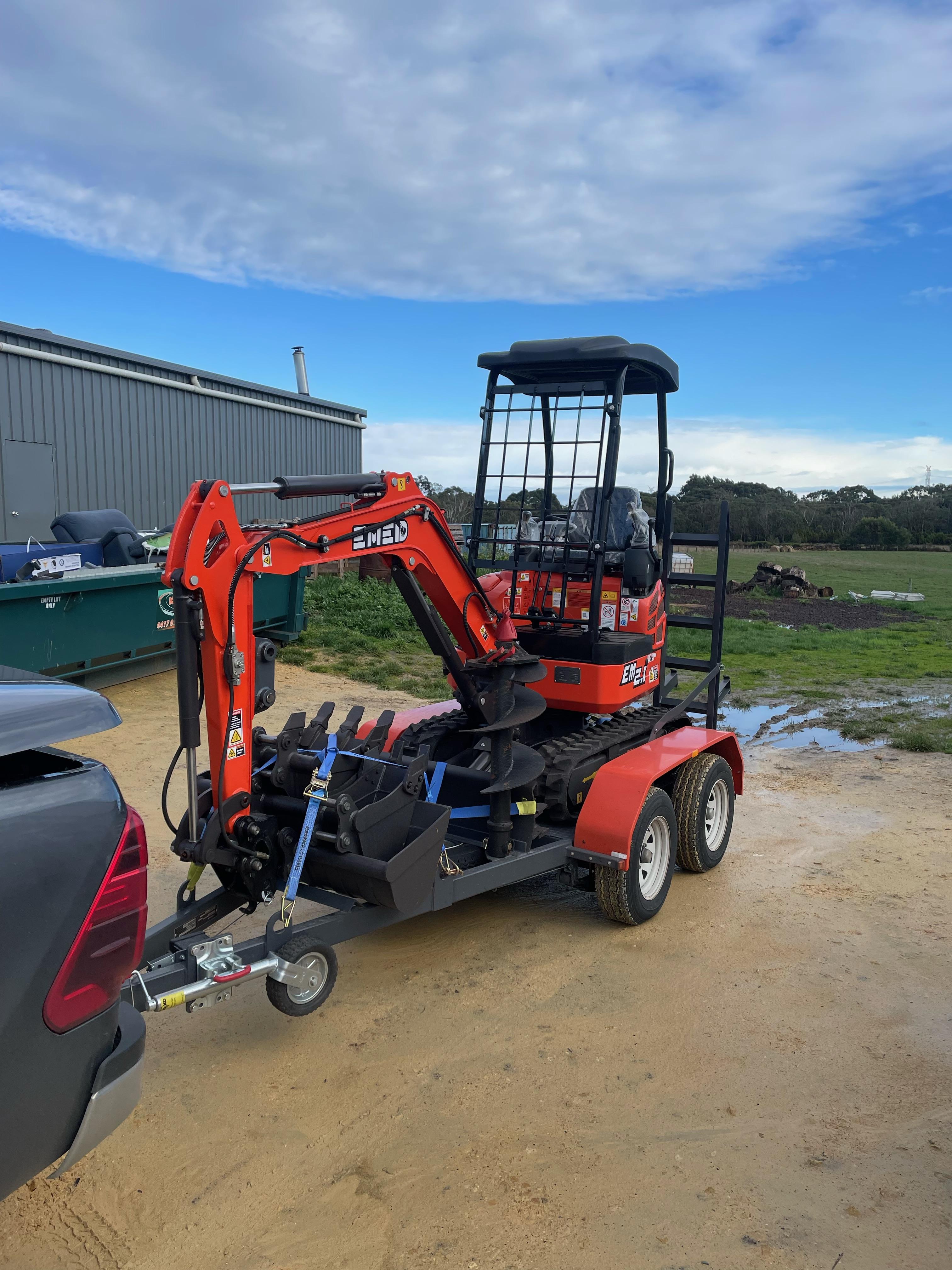 The EM2.1 is our 2 Tonne Excavator, packed full of features. Swing boom, expandable tracks, pilot controls. Coupled with our Australian made trailer This package includes: EM2.1 Excavator with swing boom and expandable tracks Trailer to suit mini Excavator 3.5 ton rated Plus the FREE Standard Inclusions: • Trenching Bucket 200mm • GP Bucket 400mm • Mud Bucket 600mm • Mud Bucket 1000mm • Hydraulic Quick Hitch • Rake • Ripper • Mechanical grab First service filter kit & Tool kit. Excavator Trailer. All Steel construction, made in Australia. Suitable for Excavators, Skid steers and other Machinery. Rated to 3.5 Ton Payload weight is 2750 kg’s Fits all attachments Width between guards is 1150mm, the bed length is 1660mm and the total length is 4.4m. 4 Wheel Electric Brakes 5 Rims and Tyres Specification: Model: EM2.1 Brand: EMED Operating Weight: 1900kg Expandable Tracks Swing Boom Digging bucket capacity: 0.048cbm Digging bucket width: 420mm Engine: YANMAR 3TNV74F Rated power: 11.2kw/11.2r/2200min Displacement: 0.854L Main Dimensions: Overall dimension (LxWxH): 3400 x 990 (1240) x 2380mm Total length of track on land: 1590mm Platform ground clearance: 473mm Platform back turning radius: 790mm Chassis width: 990mm (1240) Track width: 230mm Track height: 360mm Operating Range: Max. Digging depth: 3700mm Max. Vertical digging depth: 1740mm Max. Digging height: 3275mm Max. Dumping height: 2310mm Max. Digging radius on ground: 3610mm Min. Rotation radius: 1580mm Warranty And What It Covers: 2 Year Warranty & Lifetime Support We will supply parts and labour for the first year/1000 hours, meaning if in the unlikely event your machine breaks down during the first year, we will supply the parts and labour to get your machine operational again. This might mean taking your machine to a local repair centre, having your local mechanic visit you, or us organising another method. You are fully supported and backed up with our 1-year parts and labour guarantee we will work with you to get you sorted asap. In addition to the above we also offer a 2-year parts warranty from the date of purchase. If you have any issue with your machine outside of normal wear and tear items such as tracks, washers, batteries, fan belts etc. we will supply all parts to you so you can quickly and easily replace them and keep the machine operational. Other Benefits: Australia-wide delivery Available for private retail & commercial purchase Bulk order specialists Interested in finding out more about how our excavation machinery can better serve YOU? Well, if you’d like to know more about Earthmoving Equipment Direct or have any questions about our mini or larger sized excavators, just give us a call on 1300 020 317. Alternatively, learn more in your own time and at your own leisure with our Complimentary Price & Product Excavator Guide. Even seasoned operators and businesses who use excavators daily find the Earthmoving Equipment Direct Excavator Price and Product Guide an invaluable resource of information full of helpful tips on what to look for and avoid before buying excavators singularly or in bulk. You’ll discover some of our most popular models of excavators, from our 0.8 Ton mini excavator up to our 2.6 Ton, and other benefits based on our years of expertise in servicing and selling excavators to plumbers, builders, landscaping services, agriculture and other businesses throughout Australia. *Finance available for approved applicants Note Auger not included.