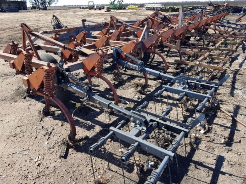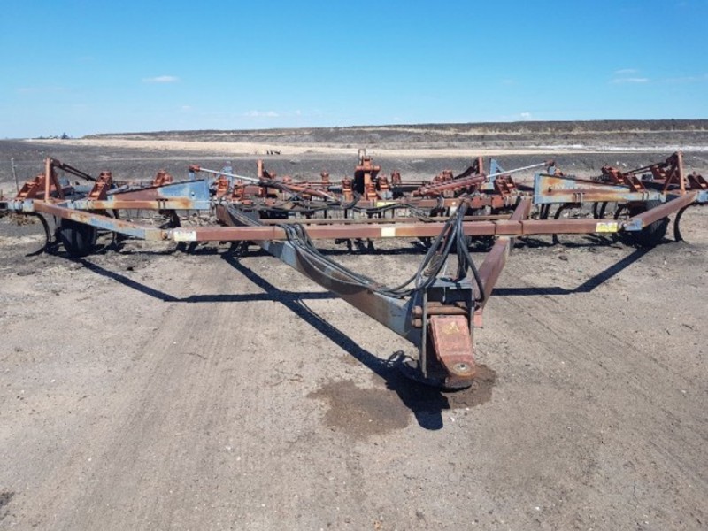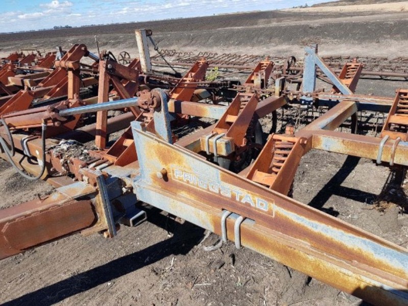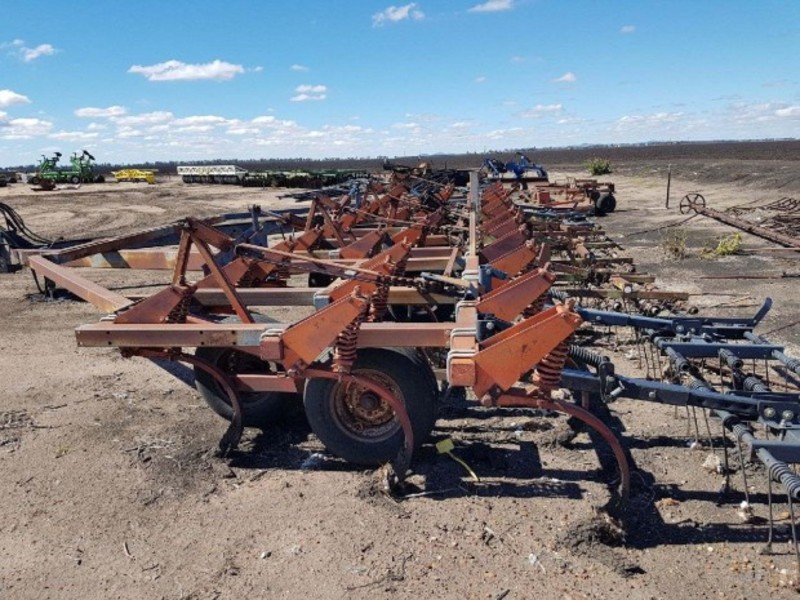 Friggstad Chisel Plough, 34 ft cut, 34 x 550lb break out tynes, 3 section folding frame, rear Flexicoil mounted 3 bar harrows, located near Cecil Plains Qld, price includes GST.