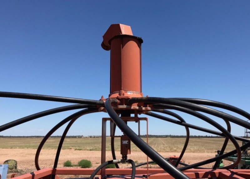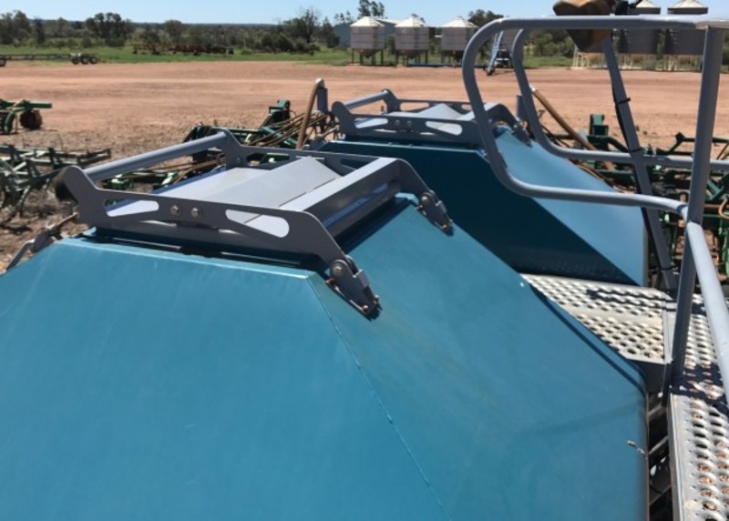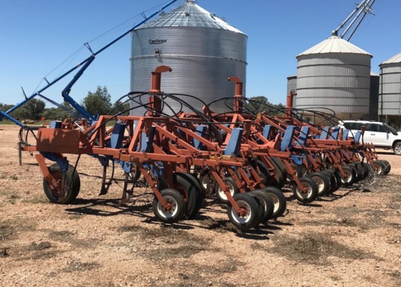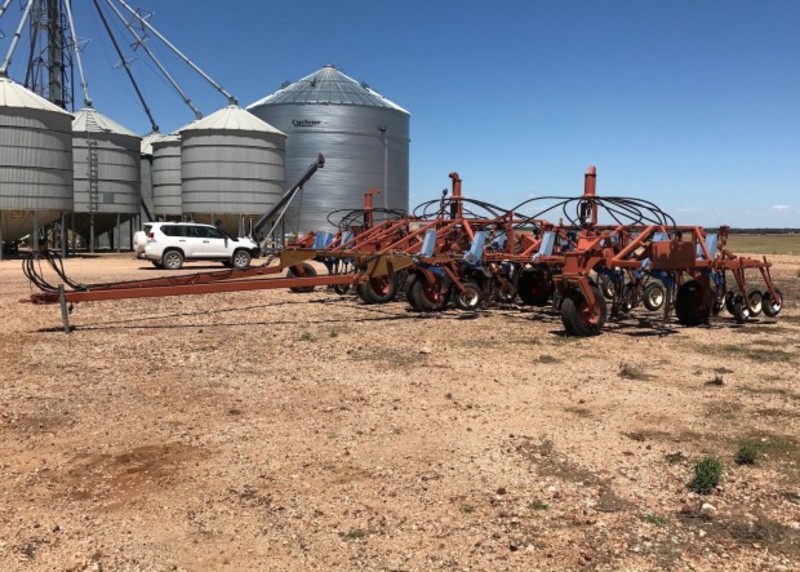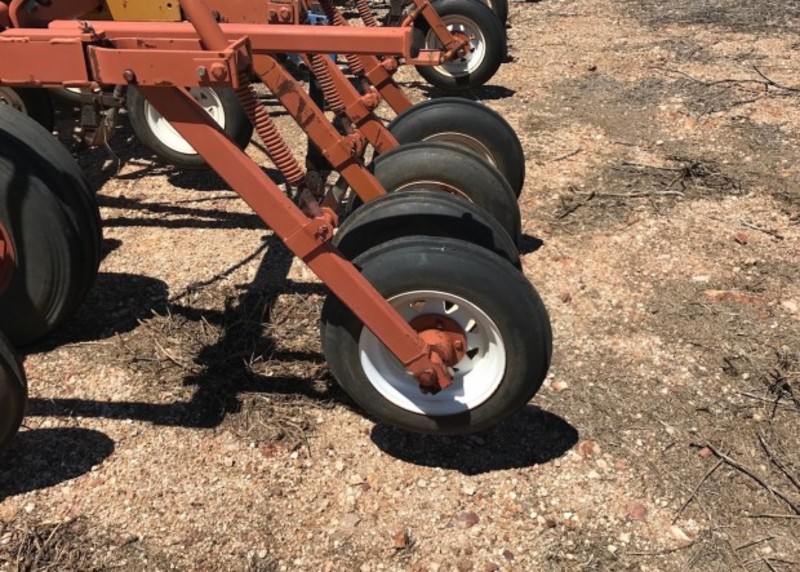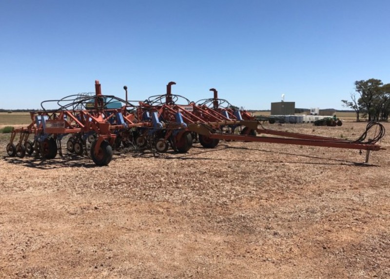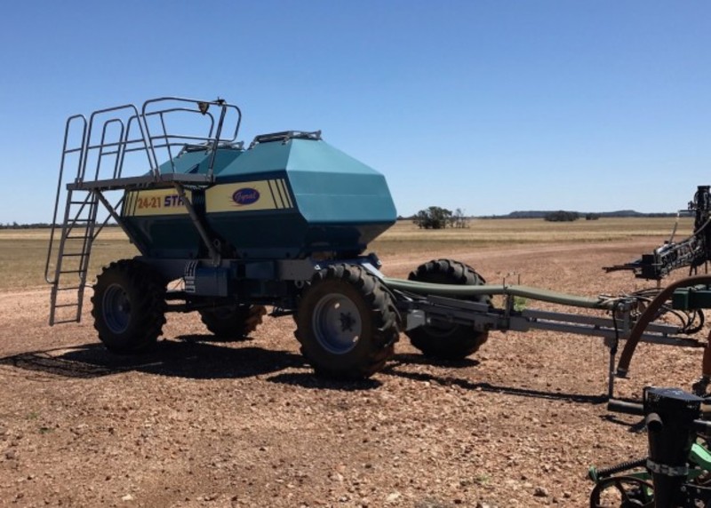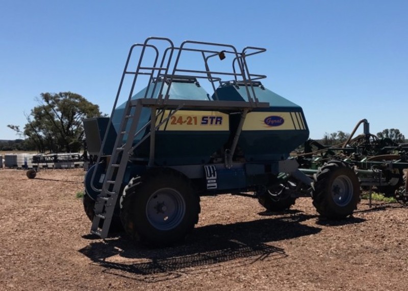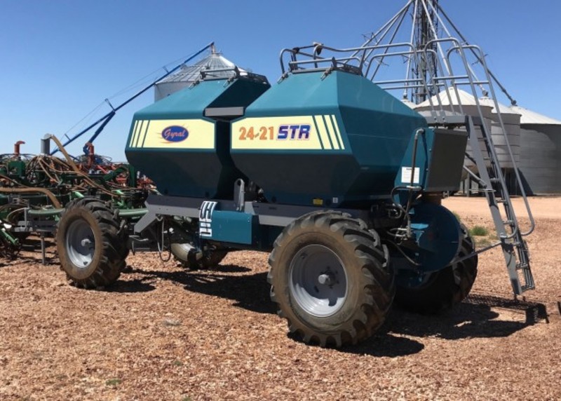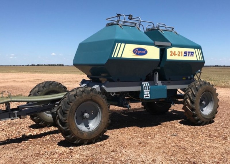 Gyral Penetrator, Series 2, 2002 build, 12 metre, 36 x straight adjustable tyne, presswheels, 333mm spacing, 3 section folding bar (no hydraulic rams or hoses), Gyral air kit with 3 primary distributor heads, air diffusers for summer crop planting, trailing Gyral 24-21 STR air cart, 2 x 2400kg bins, 2014 model, quad king pin steer, located near Bungunya, Qld, price includes GST.