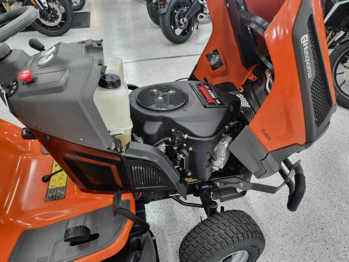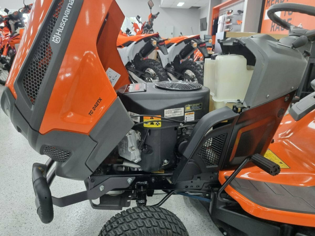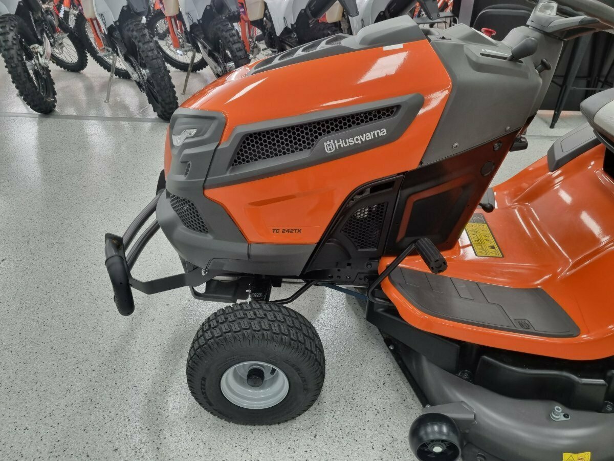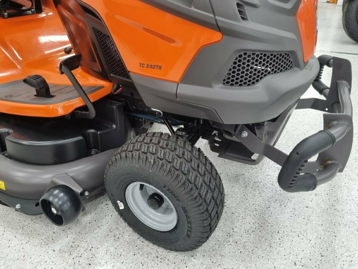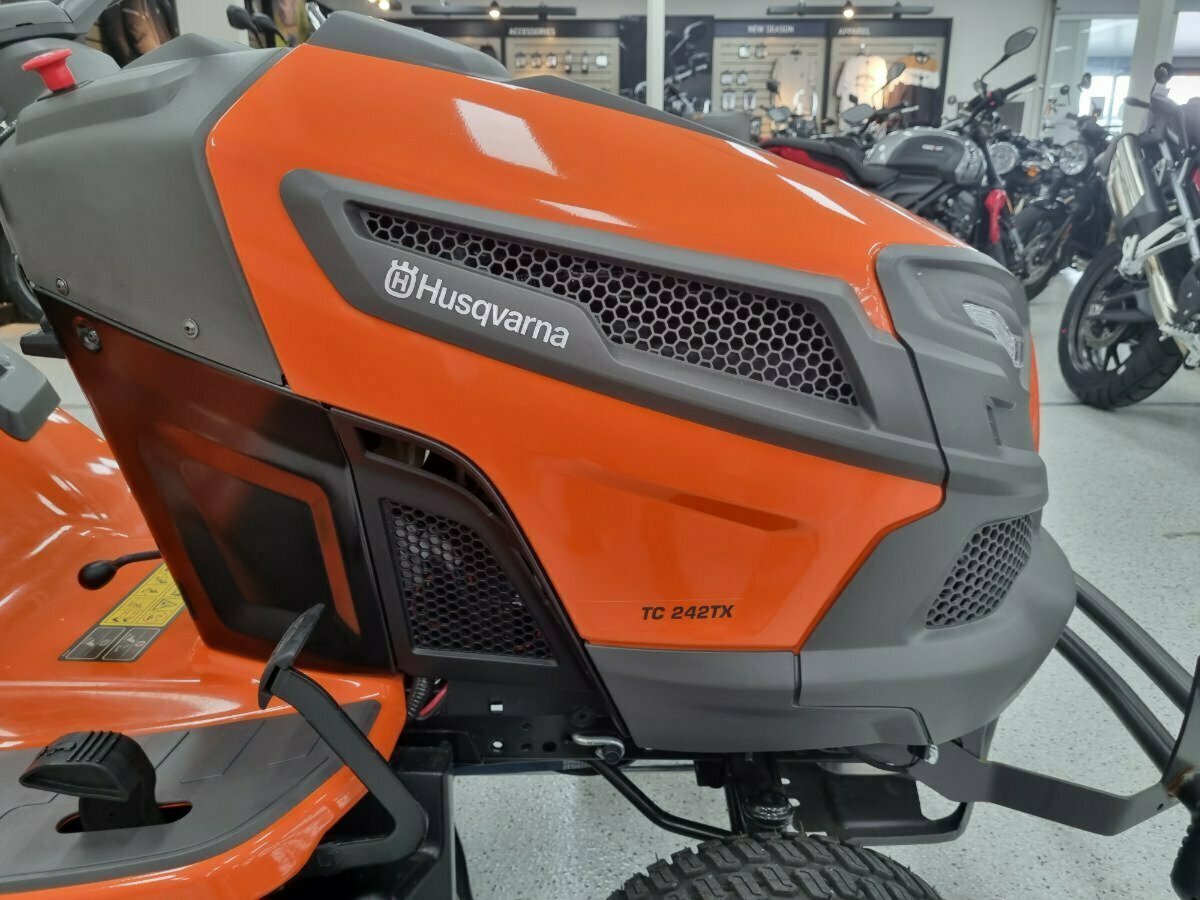 TC 242TX^Husqvarna TC 242TX is a powerful and comfortable tractor, developed for use in medium- to large-sized gardens. Equipped with integrated 320 L rear collector, pedal-operated, hydrostatic transmission and low vibe deck drive. BioClip from the 15' deluxe seat, LED lights and soft rim steering wheel.