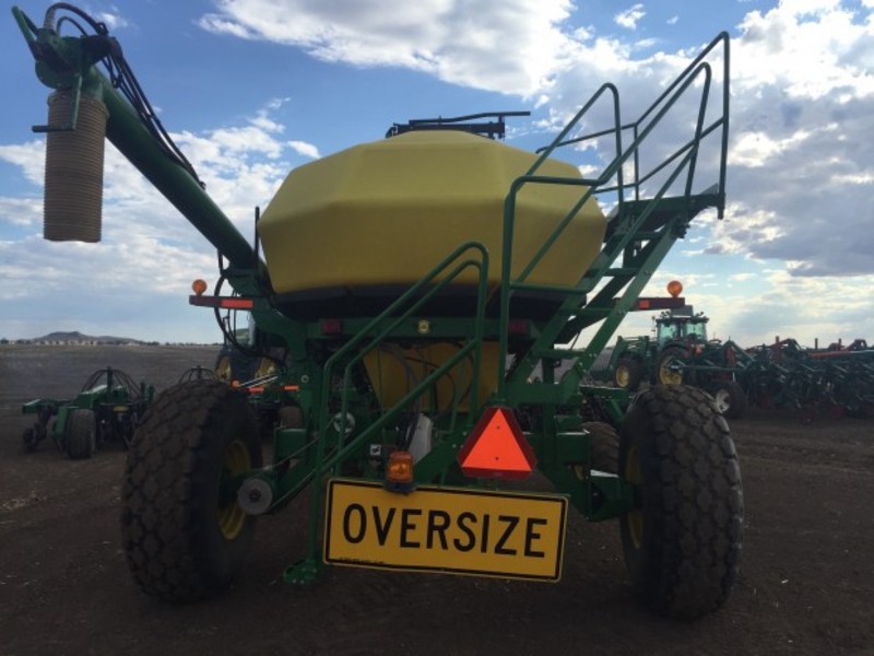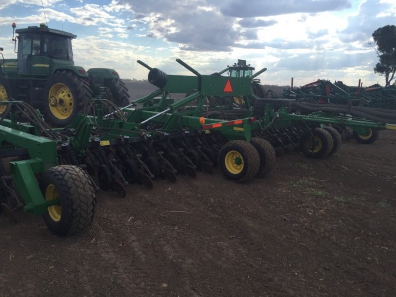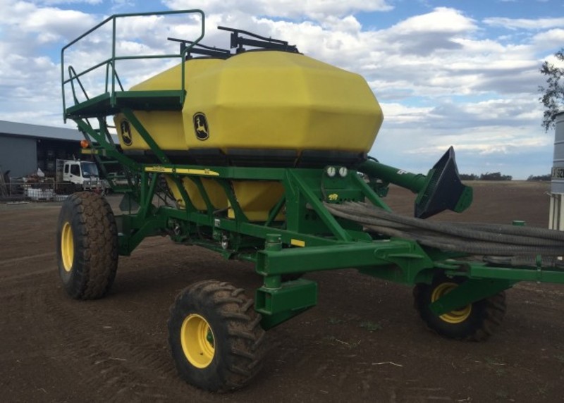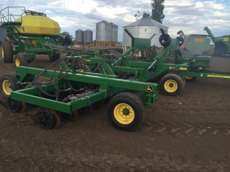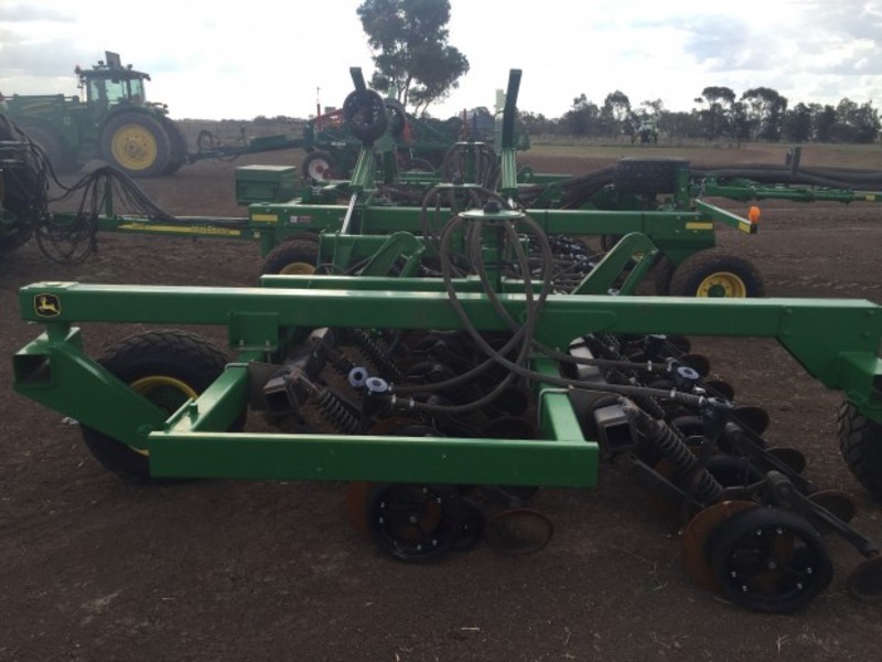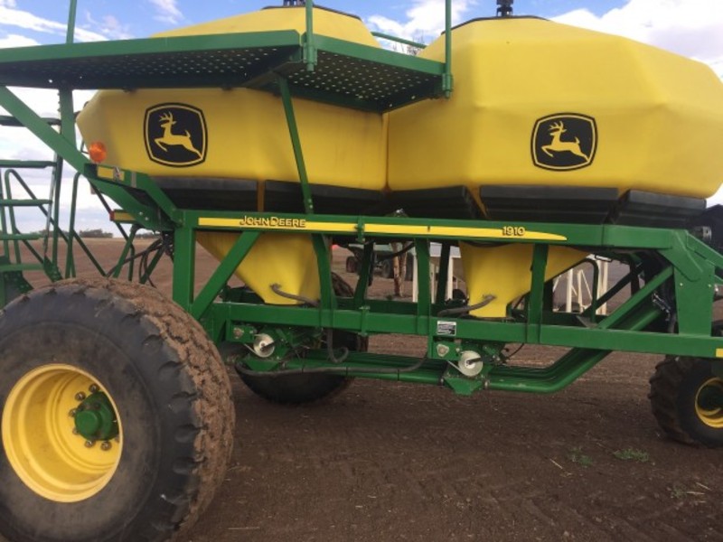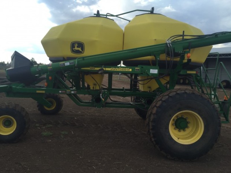 John Deere 1890 Planter, 2010 model, 12 metre (40 foot), 12 inch spacings, 42 x single disc units, air kit with blockage sensors, D-Cup diffusers, trailing John Deere 1910 air cart, tow behind, 270 bushel, 7 tonne capacity, load/unload auger, spare parts, located near Coonamble NSW, price includes GST.