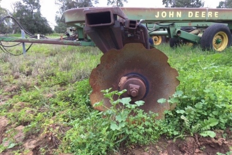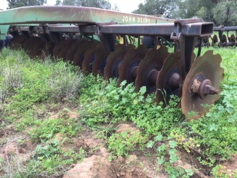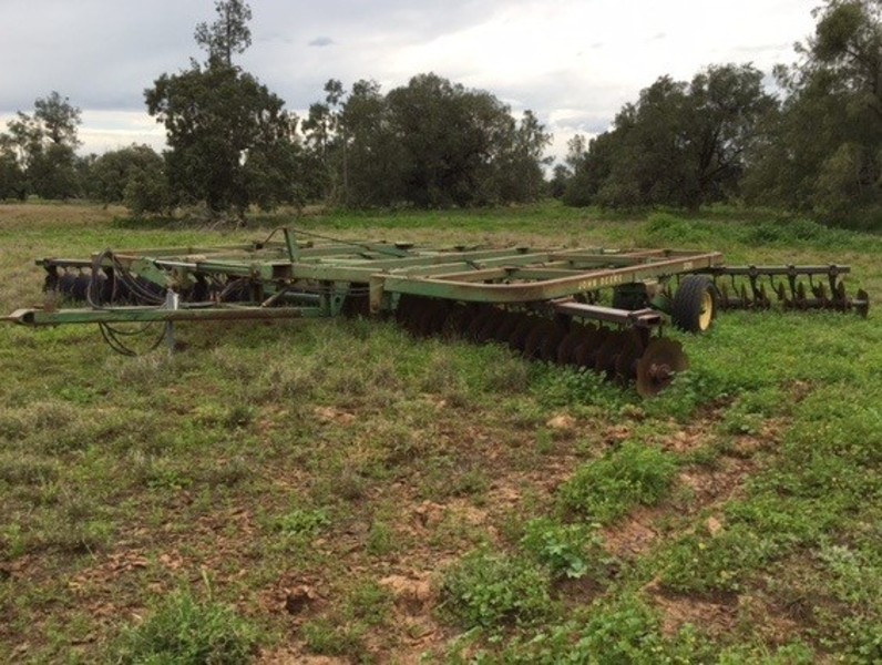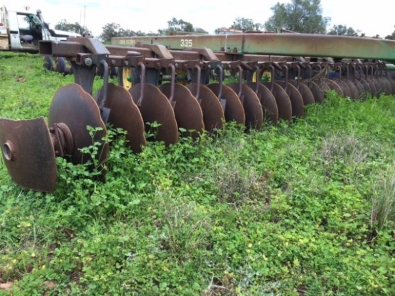 John Deere 335 Offset Disc, 92 plate offset disc, 10m cut (33 foot), folding wings, 2500 acres ago new front discs, gang bolts and bearings throughout, all lift rams have new seals in last 3 years, hoses good, tyres good, good condition throughout, located near Coonamble NSW, price includes GST.