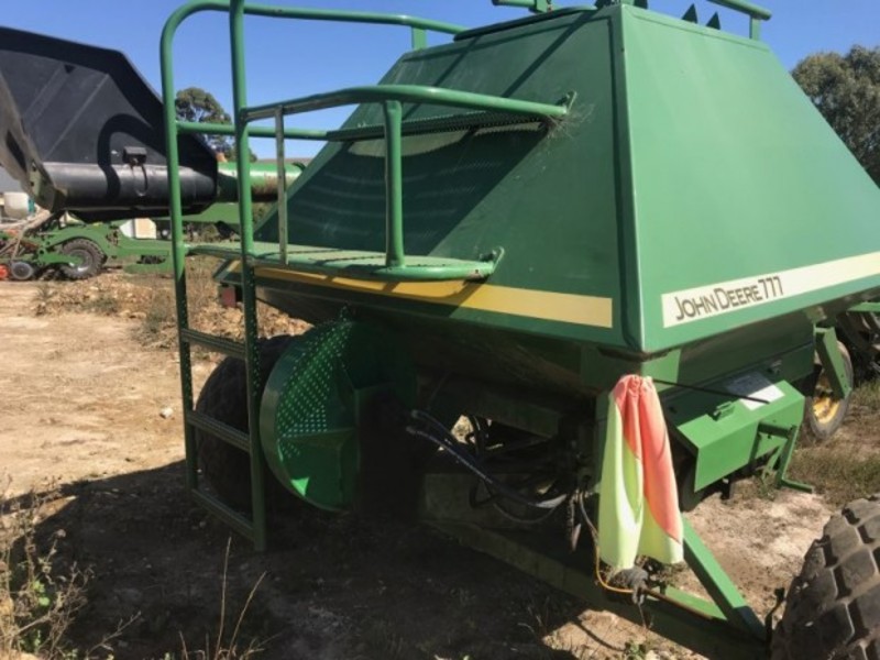 John Deere 777 Airseeder cart, trailing, trike, 4 tonne, 2 bin, 60-40 split, load/unload auger, 6 outlet, located near Mt Gambier SA, price includes GST.