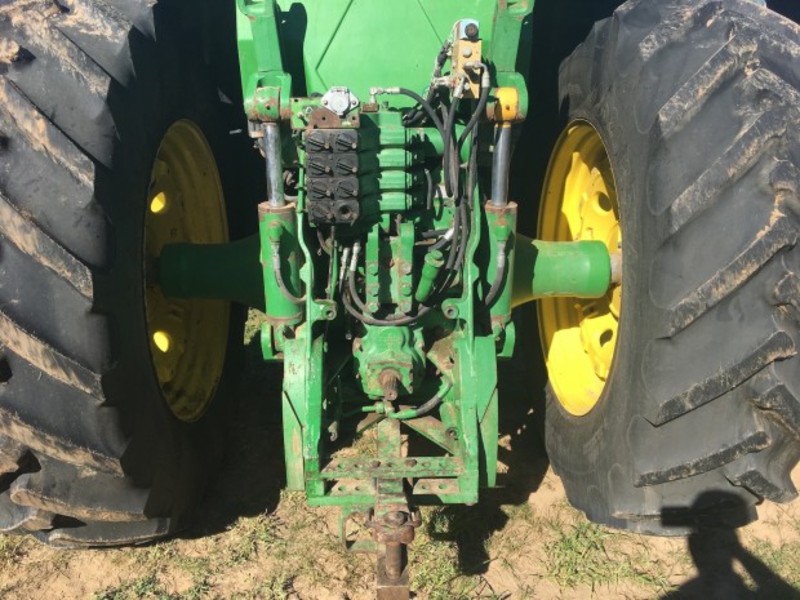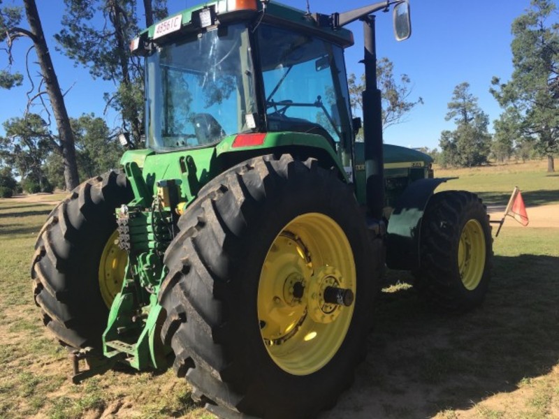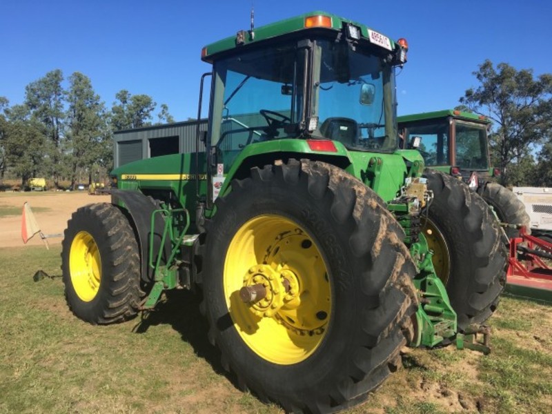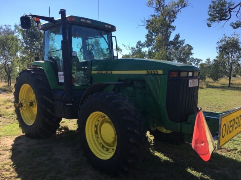 John Deere 8300 Tractor, 225 horsepower, mechanical front wheel drive, 11777 hours, 16 speed power shift transmission, 3 point linkage, 1000rpm PTO, 4 remotes, dual 520/85R42 tyres inners 90% rubber, front 420/90R30 tyres 20% rubber, front weights, UHF, located at Goondiwindi Qld, price includes GST.