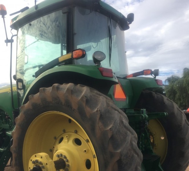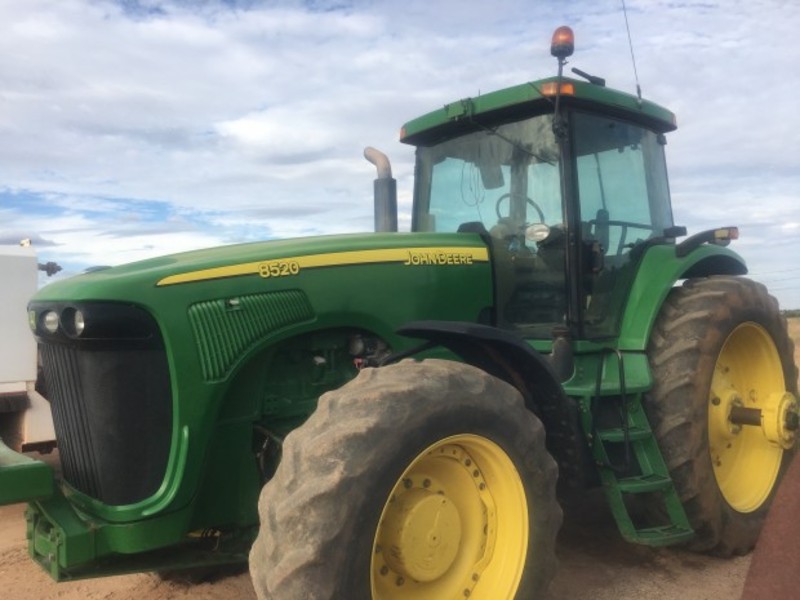 John Deere 8520 tractor, 300 horsepower, 9175 hours, ILS suspension, 16 speed powershift transmission, single 480/80R50 tyres need replacing, 3 point linkage and quickhitch, JD steering valve, major repairs just completed, located near St.George Qld, price includes GST.