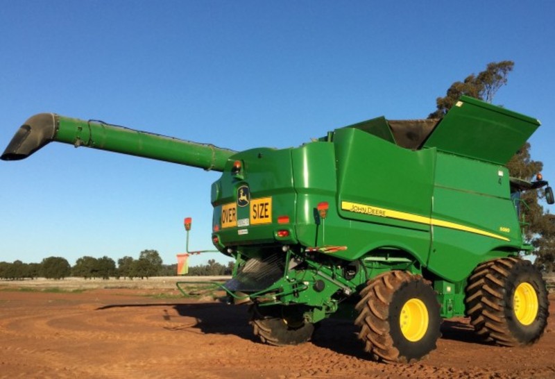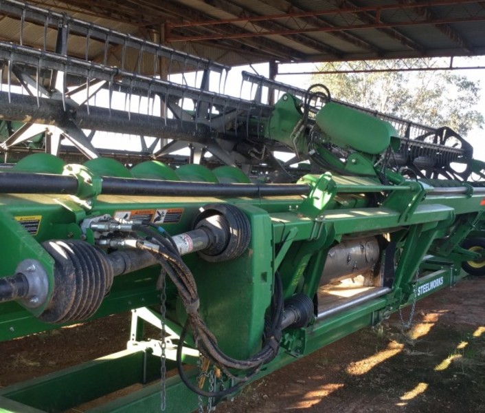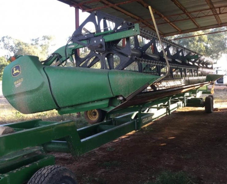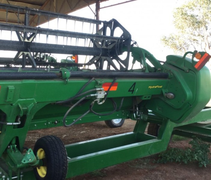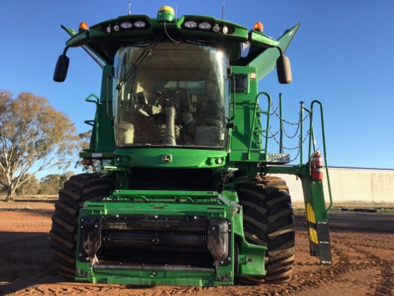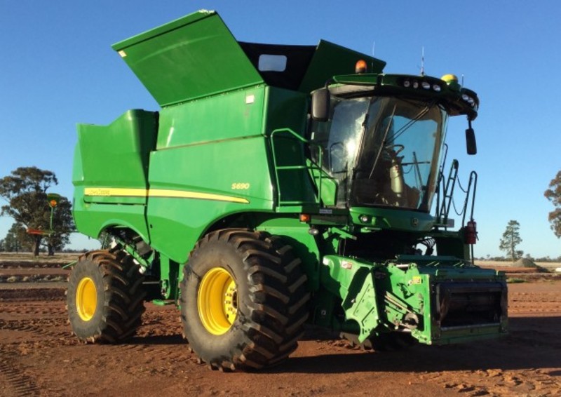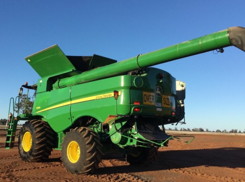 John Deere S690 Combine Harvester, 2014 model, 1293 engine hours, 935 separator hours, power folding grain tank, premium residue straw chopper, premium cab with seat covers, premium audio. 900/60R32 single drive tyres 70% rubber, 3 metre centers, rear 750/65R26 tyres 65% rubber, John Deere 2630 display mounted on armrest, no receiver or auto trac activation, JD link compatible, extended wear package and small wire concaves, 26ft unloading auger, John Deere 640D front, draper, pickup reel, 12 metre, comes with Coolamon steelworks trailer with flashing light and indicators, located near Balldale NSW, price includes GST.
