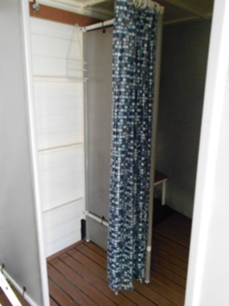 Portable shower trailer divided into male and female with 4 showering compartments and 2 storage changing areas. Complete with dividers and lighting in very good working order. Runs off two Rinnai Infinity 32 gas burners. Easy to set up and shift as required. #06 & 07